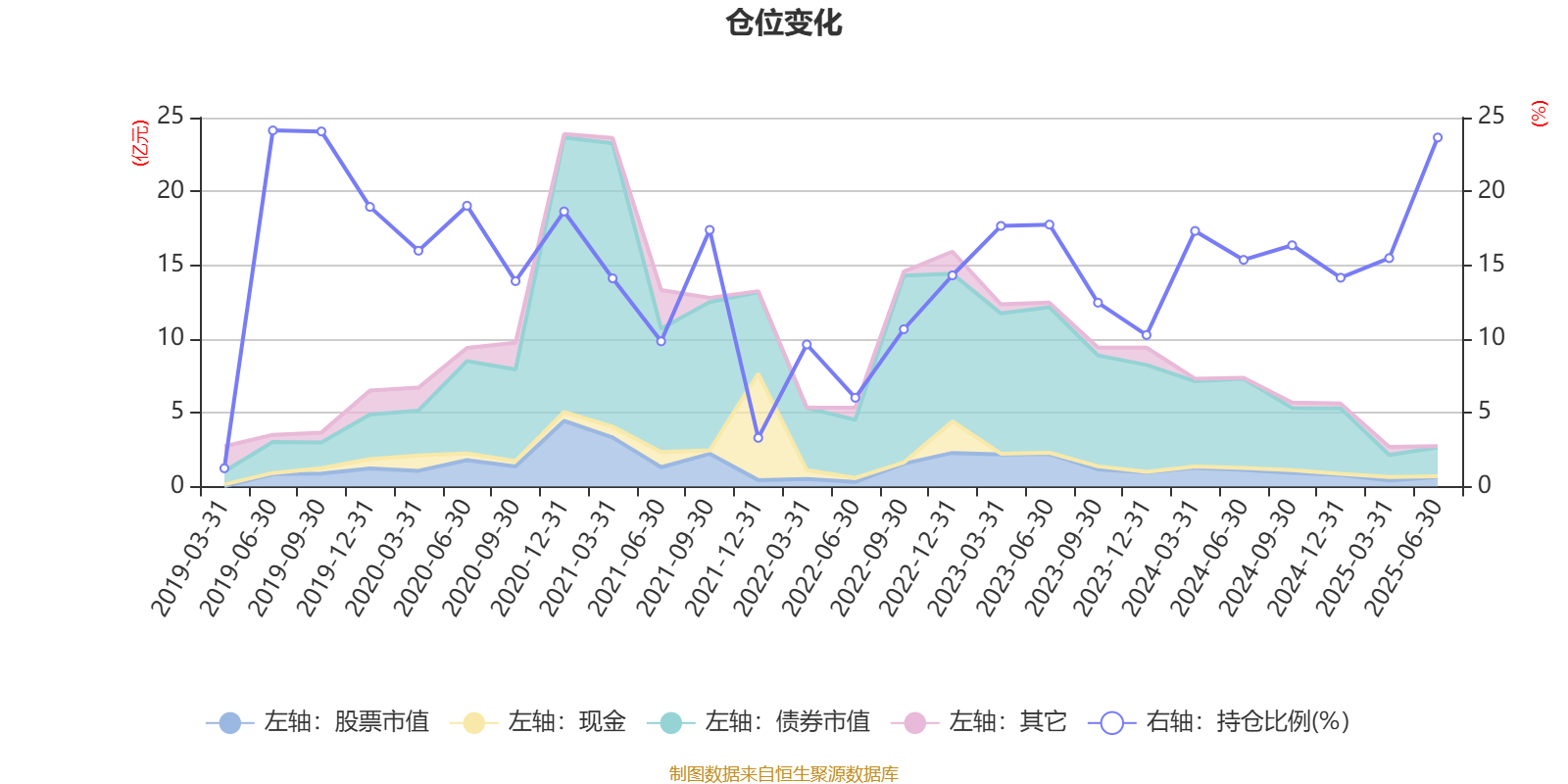 基金管理人在二季报中表示,组合在二季度整体保持中性偏低的权益仓位,随着市场企稳逐步加仓,结构上均衡配置在科技、化工、消费、高股息等方向。债券仓位方面,整体维持中性久期水平,在利率波动中适当参与了超长债的小波段交易。