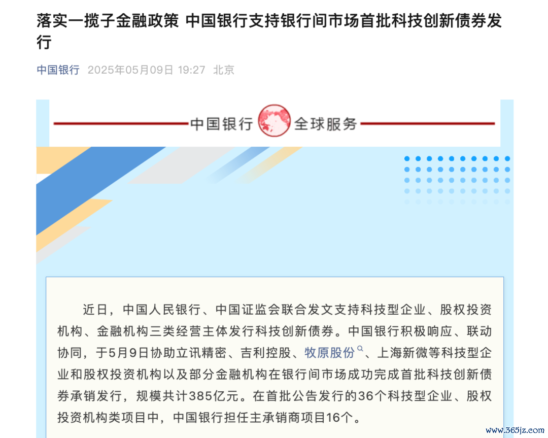 中国银行称,5月9日,该行协助立讯精密、吉利控股、牧原股份、上海新微等科技型企业和股权投资机构以及部分金融机构,在银行间市场成功完成首批科技创新债券承销发行,规模共计385亿元。在首批公告发行的36个科技型企业、股权投资机构类项目中,中国银行担任主承销商项目16个。