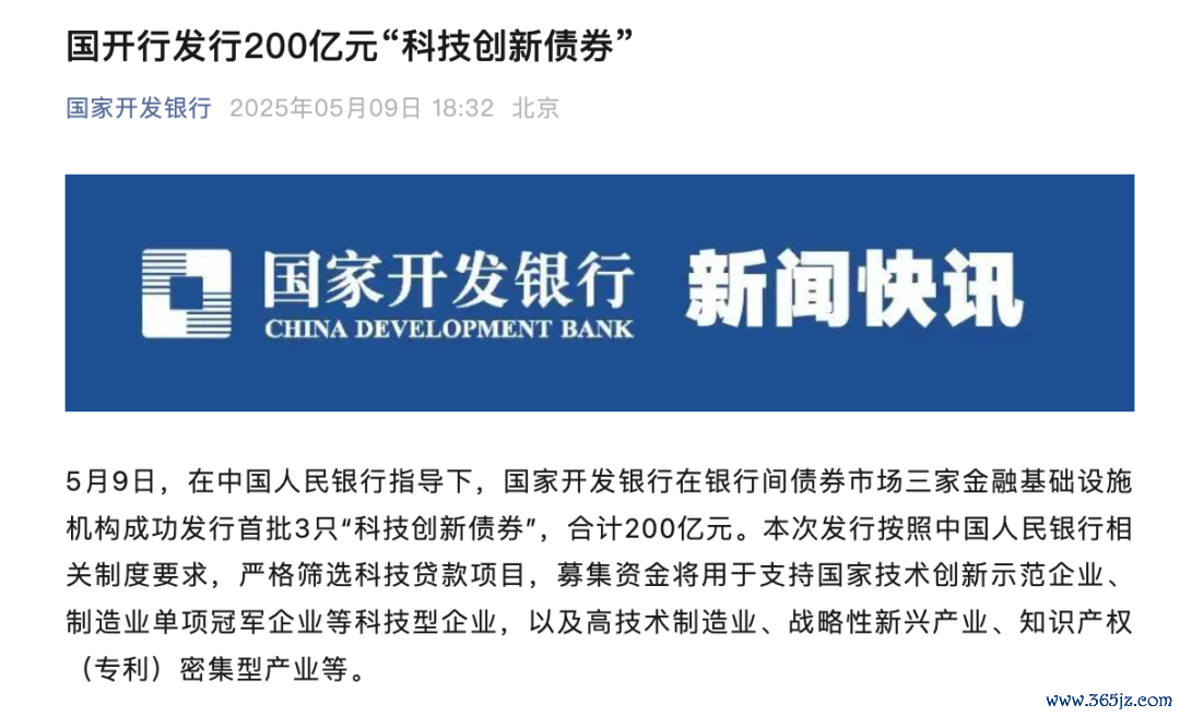 5月9日,国开行发布消息称,在央行指导下,国开行在银行间债券市场三家金融基础设施机构成功发行首批3只科技创新债券,合计200亿元。本次发行按照央行相关制度要求,严格筛选科技贷款项目,募集资金将用于支持国家技术创新示范企业、制造业单项冠军企业等科技型企业,以及高技术制造业、战略性新兴产业、知识产权(专利)密集型产业等。